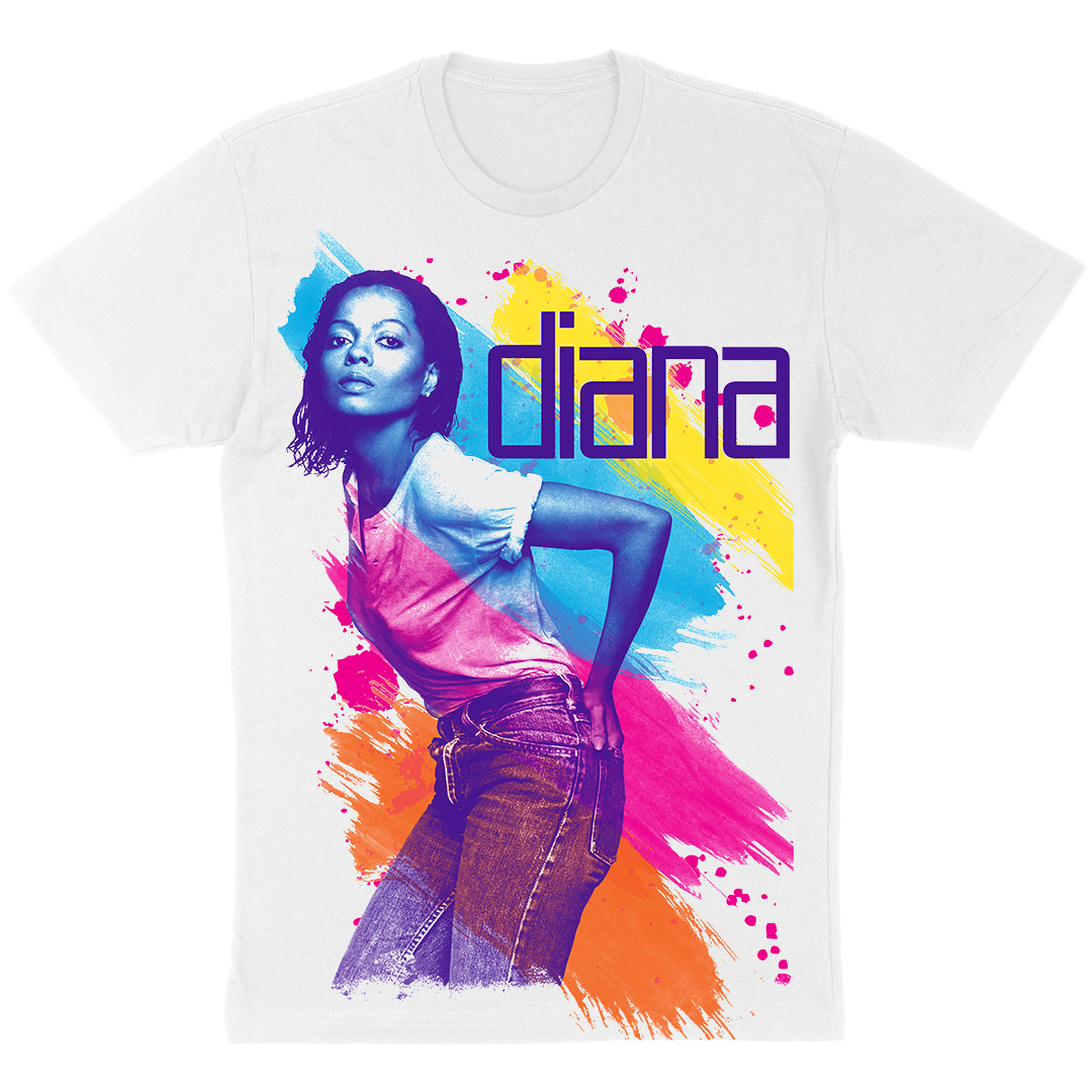 A unisex white t-shirt with the Diana Ross "Upside Down Watercolors" oversized graphic printed on the front.