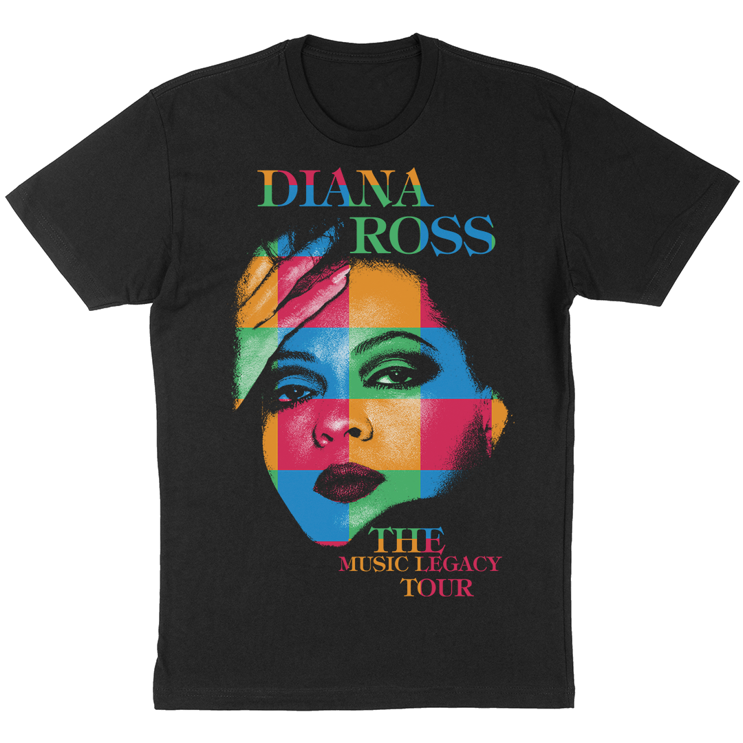 A unisex black t-shirt with the Diana Ross "Legacy Squares" graphic printed on the front and tour dates printed on the back.