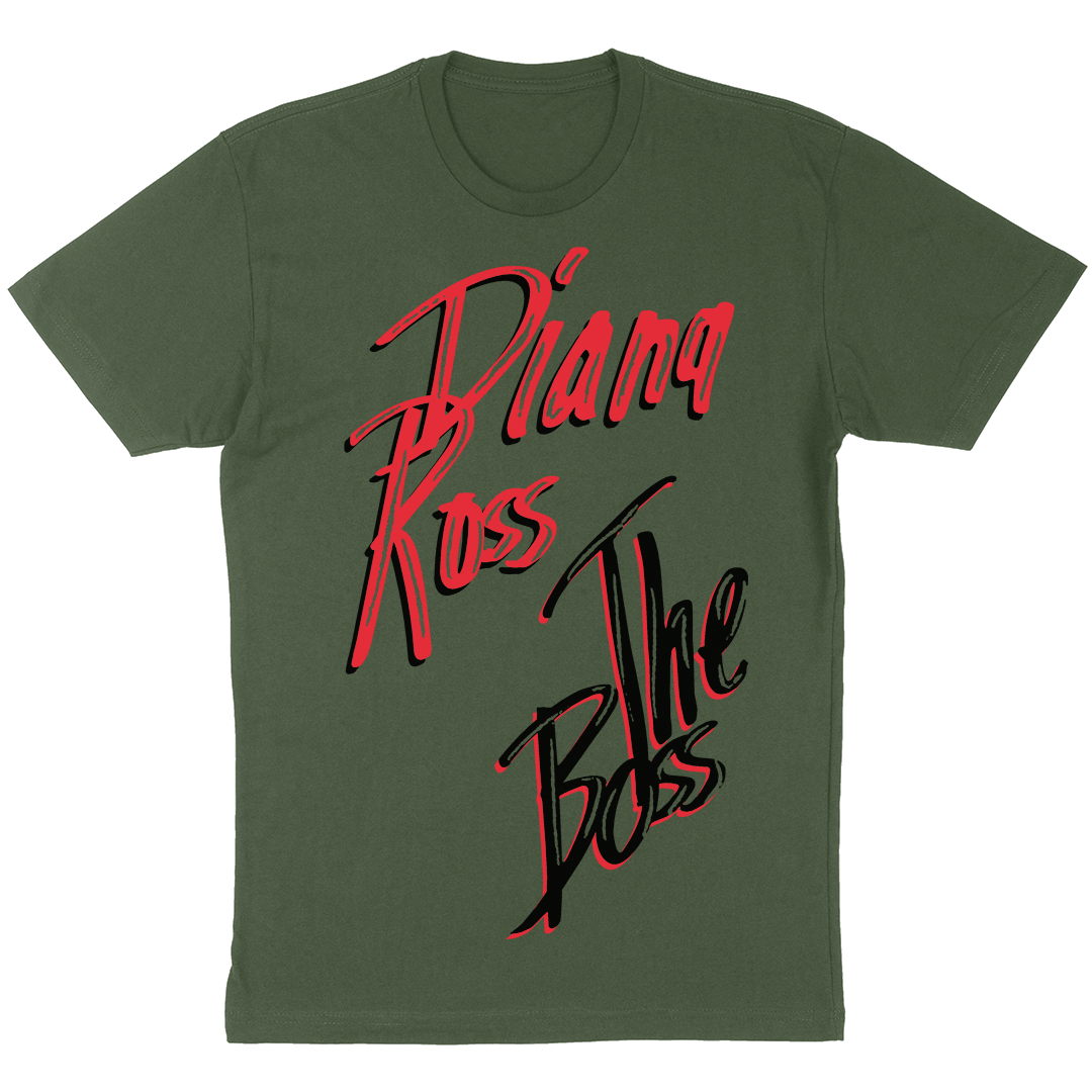 A unisex olive green t-shirt, with Diana Ross "The Boss" graphic printed on the front.