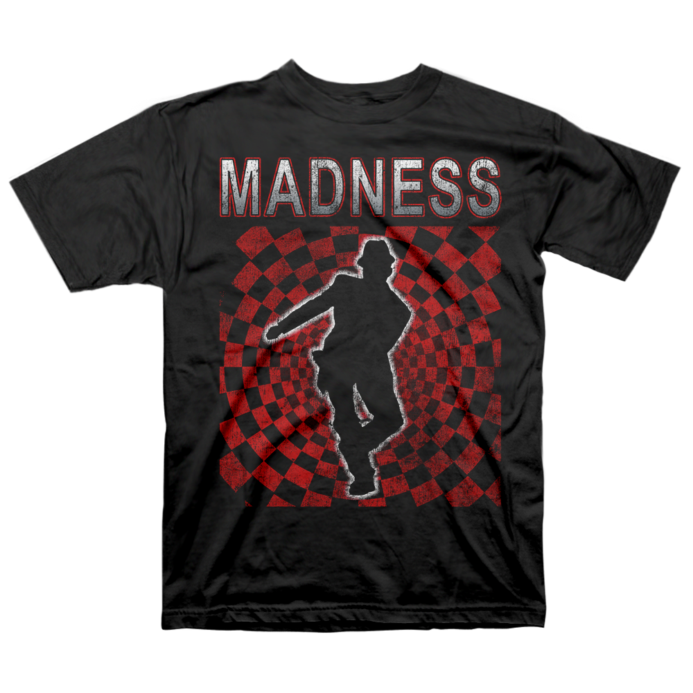 Madness "Checkered Man" design on the front of a unisex black t-shirt.