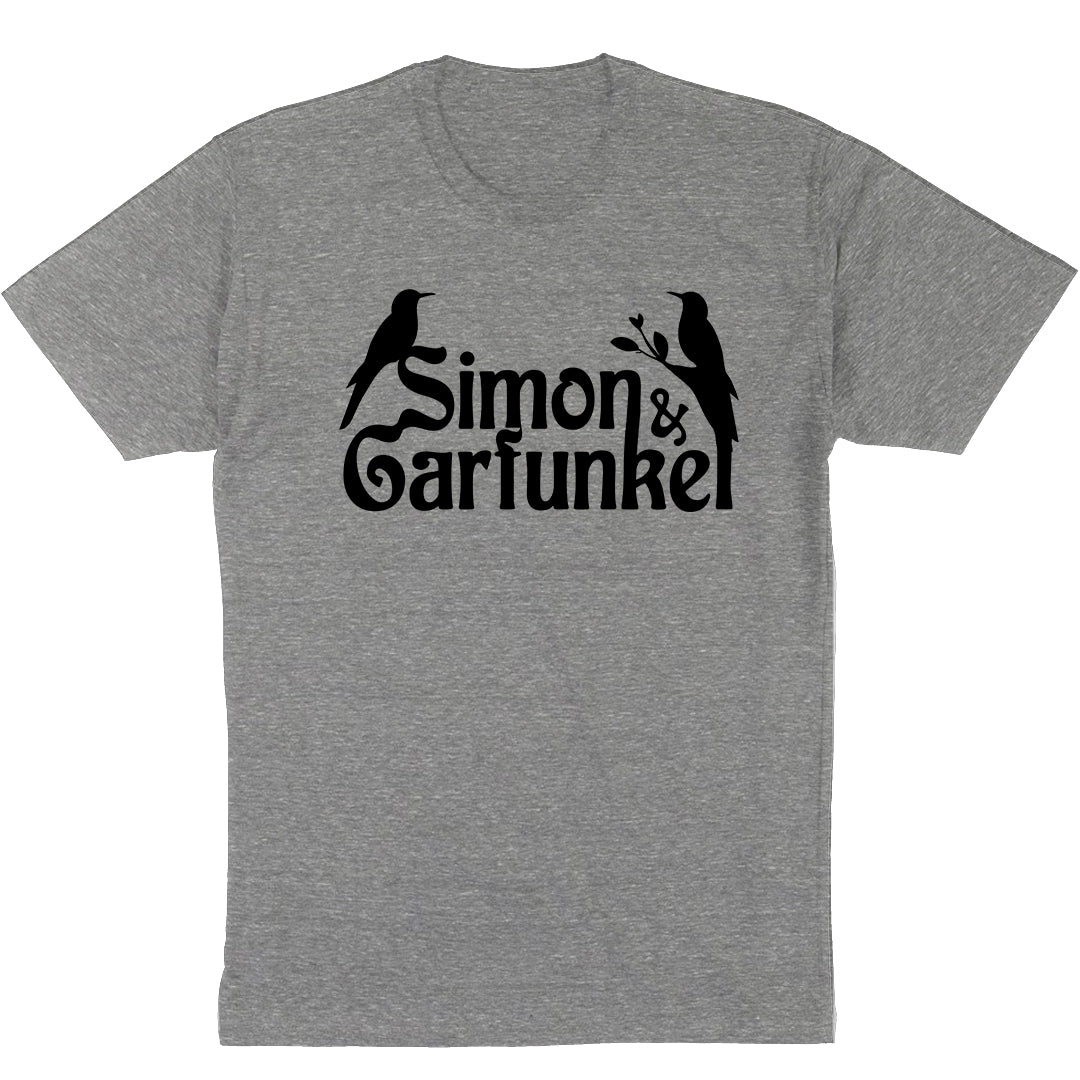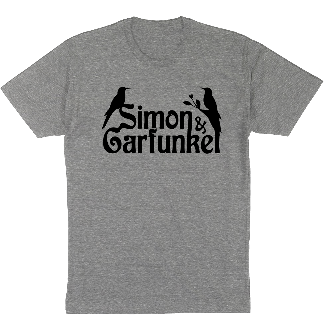A unisex crew neck tee shirt in heather grey, with Simon & Garfunkel "Birds" graphic printed on front.