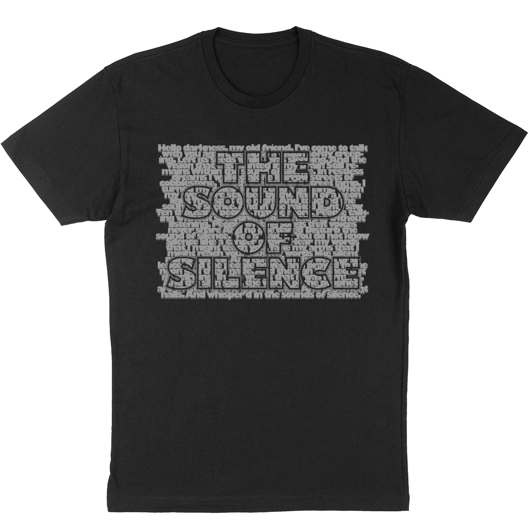 A unisex crew neck t-shirt in Black, with Simon & Garfunkel "Silence" graphic printed on front.