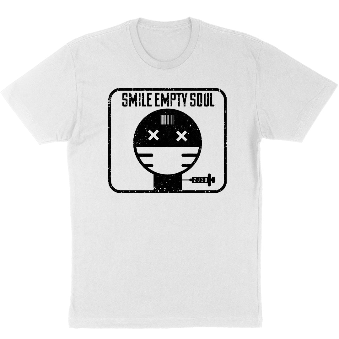 A unisex crew neck tee shirt in white, with Smile Empty Soul "2020 Album Cover" graphic printed on front.