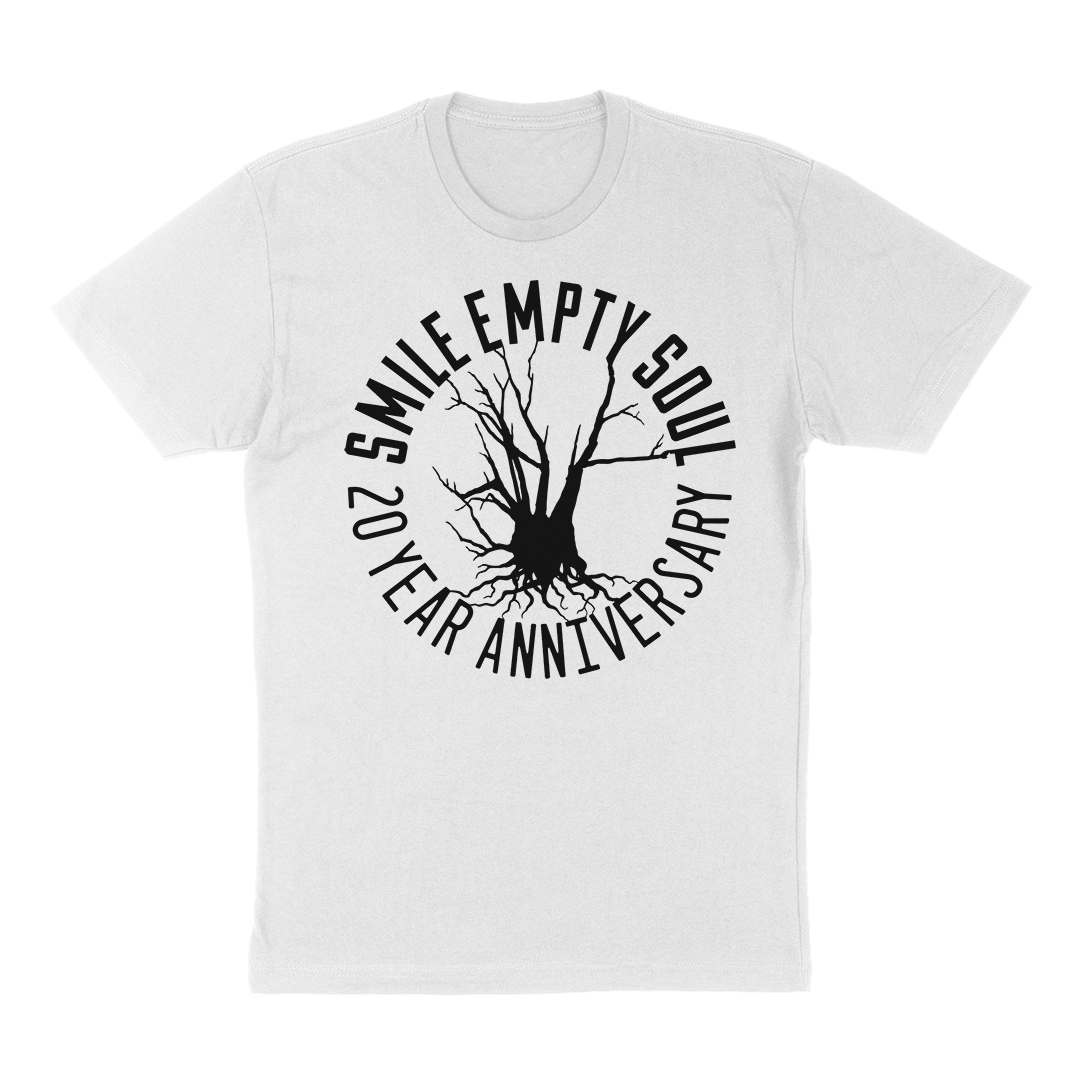 Smile Empty Soul 20th Anniversary Tree Logo printed on a white unisex 100% cotton T-shirt.