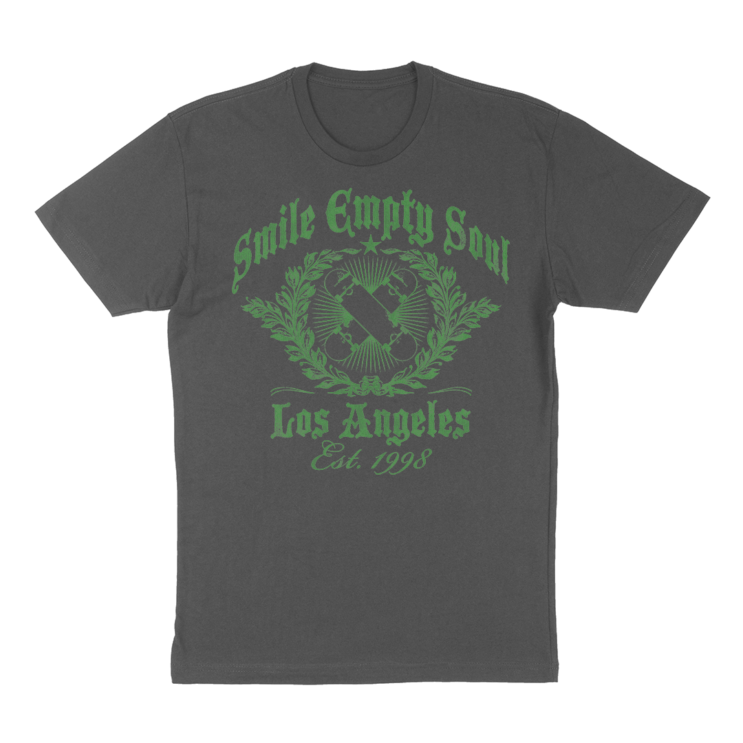 A unisex t-shirt in charcoal grey with the Smile Empty Soul "EST. 1998" graphic printed on the front in green.
